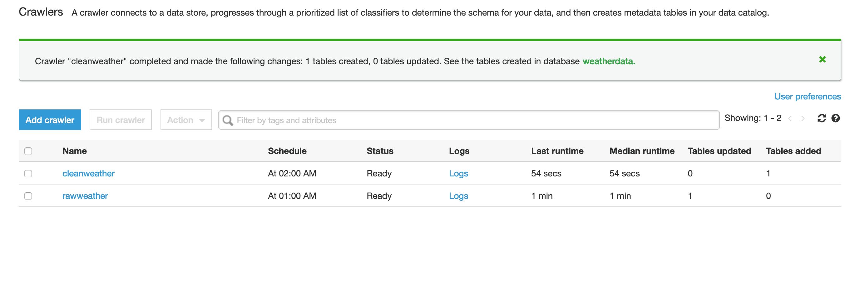 The last thing to do now is go manually kick off the new Clean Weather data Glue Crawler so that the cleaned weather data just created in the ETL job gets populated in the Glue Metadata Catalog as a new table.