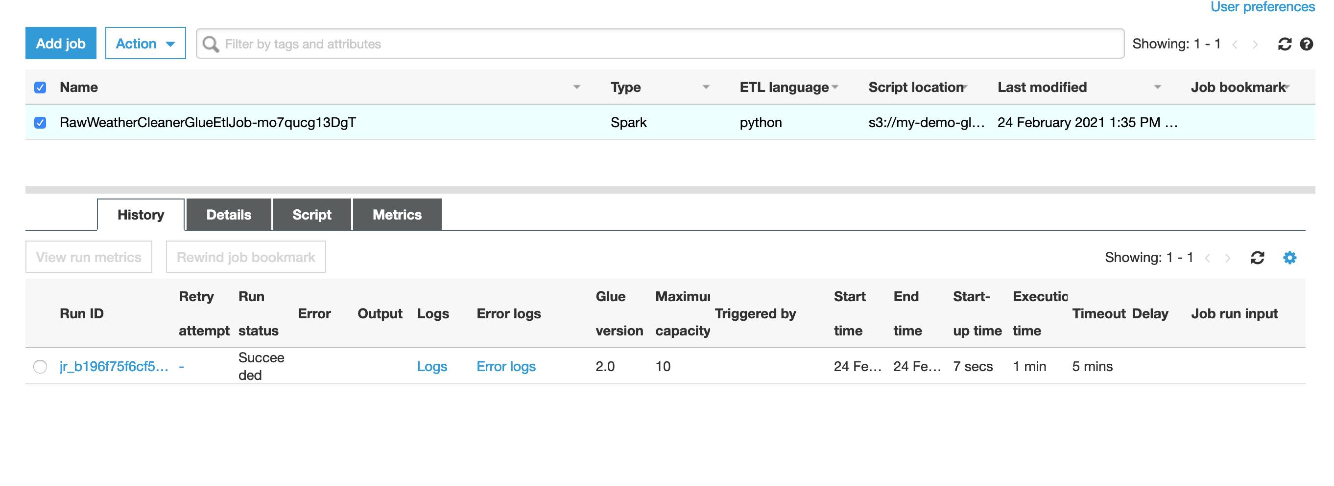 After about a minute the history tab at the bottom of the jobs UI shows the ETL job succeeded.